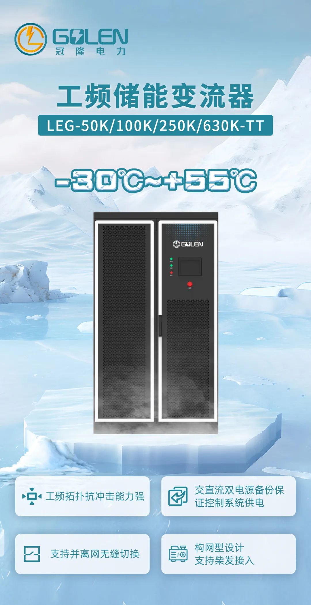該微電網(wǎng)系統(tǒng)是以冠隆電力自主研發(fā)的LEG-250K-TT構(gòu)網(wǎng)型儲(chǔ)能變流器為核心,匹配兩臺(tái)已通過(guò)歐標(biāo)認(rèn)證的冠隆241kWh液冷電池柜、輔以400kW與150kW雙功率柴油機(jī)及定制并線(xiàn)柜組成,為用戶(hù)構(gòu)建起多能互補(bǔ)、智能調(diào)度的能源保障體系。