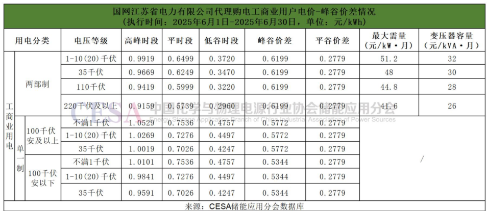 《國網(wǎng)江蘇省電力有限公司代理購電工商業(yè)用戶電價表》顯示,6月,國網(wǎng)江蘇省的各電壓等級的峰谷價差全線縮小至0.5344-0.6199元/kWh的水平,其中兩部制工商業(yè)用戶的峰谷價差為0.6199元/kWh,較5月份0.8225元/kWh的峰谷價差下降24.63%。