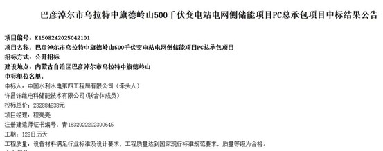 中國儲(chǔ)能網(wǎng)訊:2024年5月27日,內(nèi)蒙古巴彥淖爾市烏拉特中旗德嶺山儲(chǔ)能項(xiàng)目PC總承包中標(biāo)結(jié)果正式揭曉,中國水利水電第四工程局與許昌許繼電科儲(chǔ)能技術(shù)有限公司組成的聯(lián)合體憑借23288.4838萬元、折合單價(jià)0.582元/Wh的報(bào)價(jià)成功中標(biāo)。