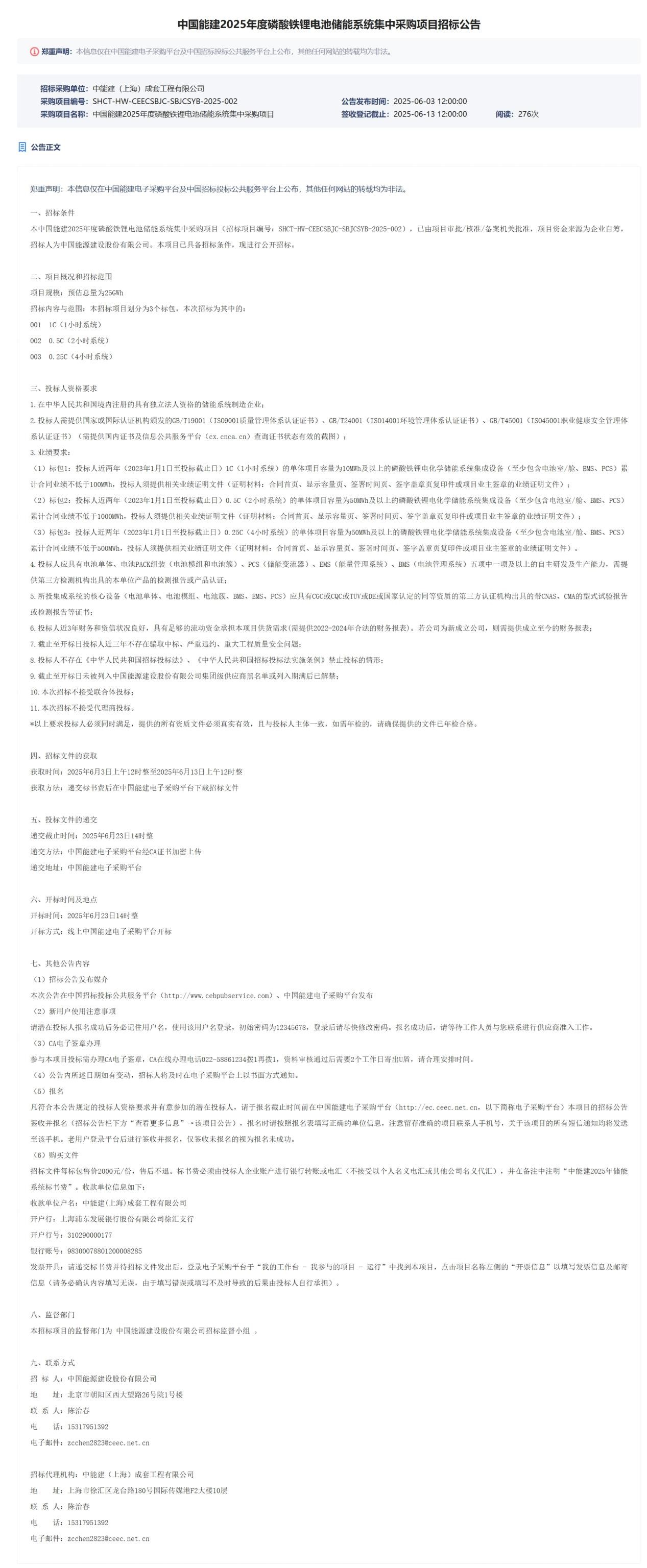 中國儲能網(wǎng)訊:2025年6月3日,中能建(上海)成套工程有限公司發(fā)布中國能建2025年度磷酸鐵鋰電池儲能系統(tǒng)集中采購項目招標公告,本次預(yù)估總量為25GWh,劃分為3個標包,本次招標為其中的:標包1為1C(1小時系統(tǒng))、標包2為0.5C(2小時系統(tǒng))、標包3為0.25C(4小時系統(tǒng))。