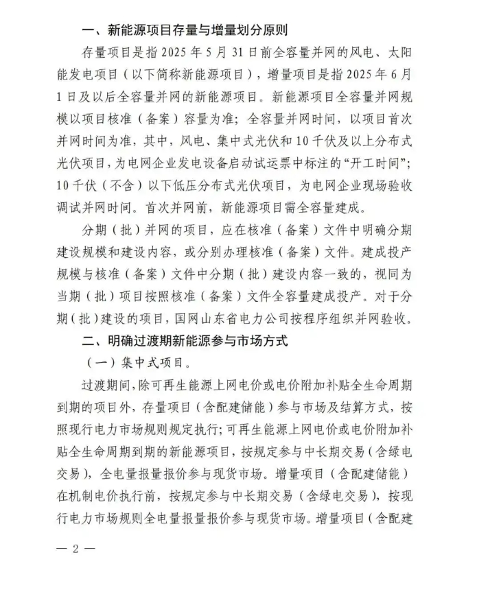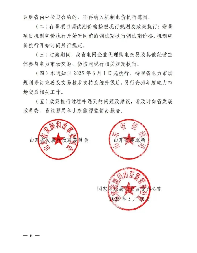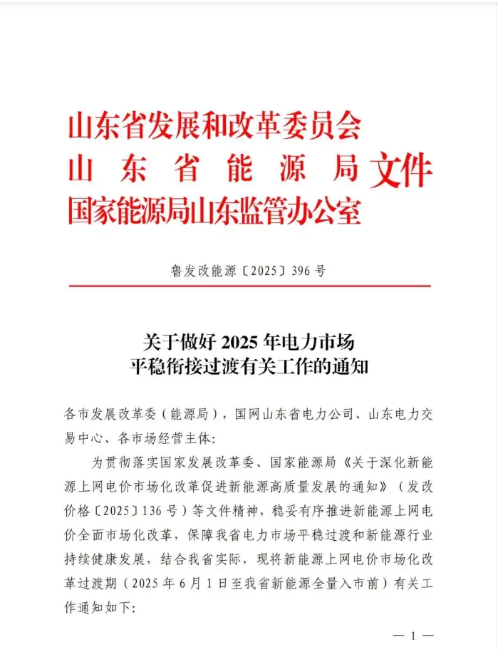 中國(guó)儲(chǔ)能網(wǎng)訊:5月30日,山東省發(fā)改委、山東省能源局、國(guó)家能源局山東監(jiān)管辦聯(lián)合印發(fā)《關(guān)于做好 2025 年電力市場(chǎng)平穩(wěn)銜接過渡有關(guān)工作的通知》,就6月1日至開始執(zhí)行機(jī)制電價(jià)時(shí)間段的新能源項(xiàng)目給出有關(guān)要求。