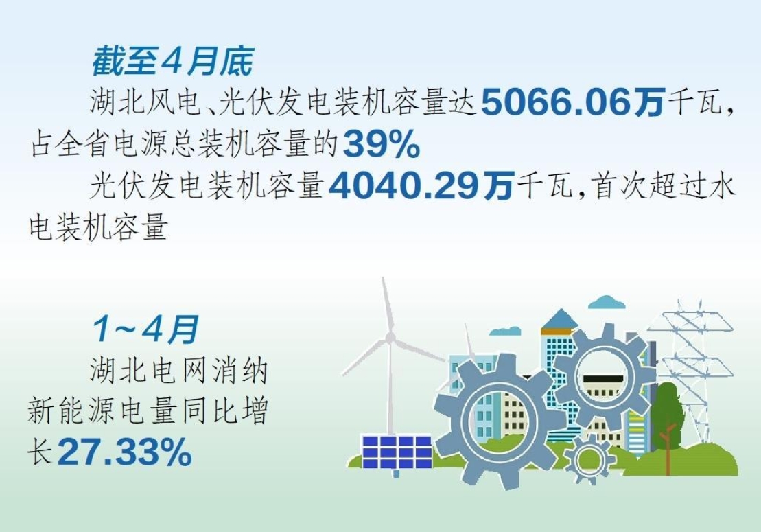中國(guó)儲(chǔ)能網(wǎng)訊:5月15日從國(guó)網(wǎng)湖北省電力有限公司獲悉,截至4月底,湖北風(fēng)電、光伏發(fā)電裝機(jī)容量達(dá)5066.06萬(wàn)千瓦,占全省電源總裝機(jī)容量的39%。其中,光伏發(fā)電裝機(jī)容量4040.29萬(wàn)千瓦,首次超過(guò)水電裝機(jī)容量。