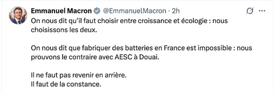 馬克龍發(fā)推文稱:“有人說(shuō),我們必須在經(jīng)濟(jì)增長(zhǎng)與可持續(xù)之間做出選擇,但我們選擇兩者都要;有人說(shuō),在法國(guó)制造電池是不可能的,遠(yuǎn)景動(dòng)力杜埃工廠證明了并非如此。我們不能倒退,我們必須持續(xù)堅(jiān)定的前行?!?/span>