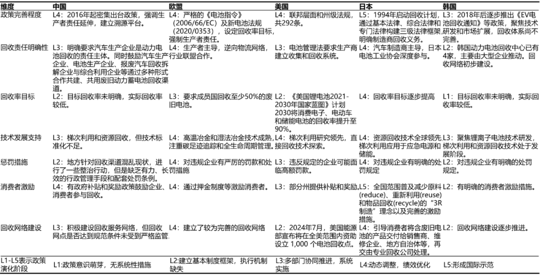 表1 中國(guó)與其他國(guó)家在廢動(dòng)力電池管理7個(gè)維度上的政策演進(jìn)階段(截至2024年)
