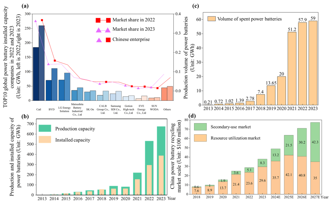 圖3 中國(guó)動(dòng)力電池回收市場(chǎng)規(guī)模。(a)表示全球動(dòng)力電池裝機(jī)量Top10的情況(單位:GWh)。其中有方塊和三角形標(biāo)記的是中國(guó)企業(yè)。(b)表示2013-2023年中國(guó)動(dòng)力產(chǎn)能、電池裝機(jī)量;(c)表示中國(guó)2013-2023年退役動(dòng)力電池預(yù)估產(chǎn)生量。(d)表示2018-2027年中國(guó)動(dòng)力電池梯次利用和回收利用市場(chǎng)規(guī)模預(yù)測(cè)值