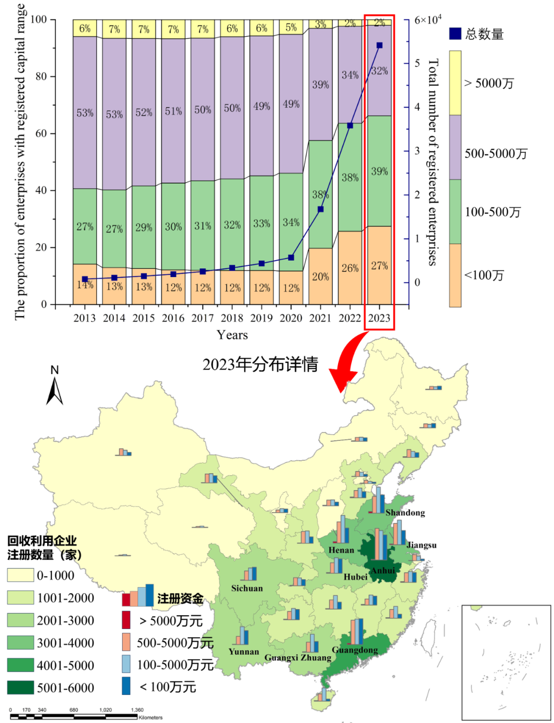 圖4 2013 - 2023年中國(guó)大陸動(dòng)力電池回收企業(yè)數(shù)量、注冊(cè)資本占比、及2023年各省回收企業(yè)分布情況