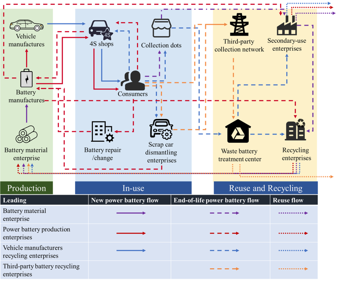 圖5 以電池材料企業(yè)、動(dòng)力電池生產(chǎn)企業(yè)、整車企業(yè)和第三方企業(yè)為主導(dǎo)的4種回收商業(yè)模式。紫色、紅色、藍(lán)色和黃色線條分別表示電池材料企業(yè)、動(dòng)力電池生產(chǎn)企業(yè)、整車企業(yè)和第三方企業(yè)主導(dǎo)的回收模式過程