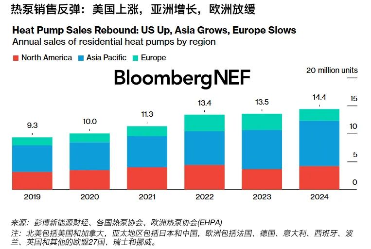 2024年全球熱泵銷量增長6%,亞太地區(qū)以16%的增幅引領(lǐng)增長,北美地區(qū)也出現(xiàn)反彈。受補貼削減和天然氣價格下跌的影響,歐洲熱泵銷量下降27%。