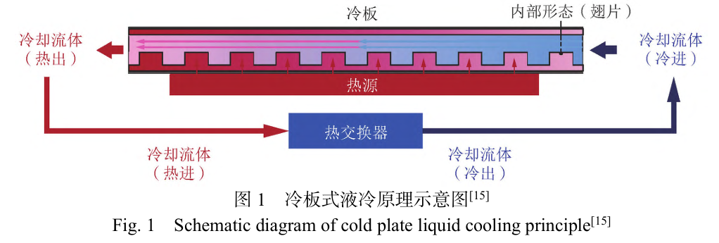 冷板式液冷主要組成部件是冷板、液體管道和液體介質(zhì),其原理如圖1所示,芯片工作時(shí)產(chǎn)生的熱量通過液冷板間接傳遞到液體介質(zhì)中并被帶走。1981年,TUCKERMAN等首次使用微通道冷板對芯片進(jìn)行冷卻。如今,冷板式液冷在液冷數(shù)據(jù)中心中應(yīng)用最廣泛。為了提高冷板式液冷的傳熱效率,降低能耗,可以通過對微通道冷板結(jié)構(gòu)優(yōu)化、液體介質(zhì)相變特性利用以及新型液體介質(zhì)開發(fā)三個(gè)方向進(jìn)行研究。