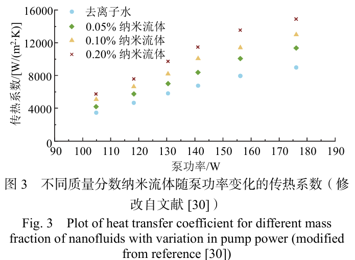 HOANG等通過實(shí)驗(yàn)測定不同流體介質(zhì)的熱力性能和水力性能,將乙二醇加入水中,熱力性能無明顯變化,但乙二醇的黏度導(dǎo)致水?乙二醇溶液的壓降為20.1kPa,比純水的5.8kPa高,而水和水?乙二醇混合液的熱力性能比介電冷卻劑Novec 7000 HFE高。HO等在水中加入氧化鋁納米顆粒,形成質(zhì)量分?jǐn)?shù)為8%的納米流體,在熱源密度為6.8W/cm2時(shí), 傳熱性能比純水提高了40%,且隨著流速增加,品 質(zhì)因數(shù)(figure of merit, FOM)達(dá)到了1.27,平均傳 熱效率提高了40%,盡管增加了傳熱性能,同時(shí)也增加了流動(dòng)阻力,綜合起來使用納米顆粒依舊是有效的。但納米顆粒長時(shí)間使用后會(huì)團(tuán)聚導(dǎo)致流道堵塞,MASHALI等在去離子水中添加納米金剛石顆粒,如圖3所示,使用體積分?jǐn)?shù)φ=0.2%的納米金剛石顆粒溶液傳熱系數(shù)比去離子水提升69%,而且可靠性分析表明納米金剛石顆粒流體可以在兩年內(nèi)保持物理性質(zhì)的穩(wěn)定,具有重要的市場意義。