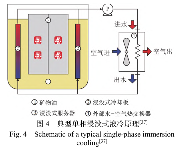 單相浸沒式液冷是利用冷卻液的比熱容吸收熱量,主要優(yōu)點(diǎn)是換熱效率高、結(jié)構(gòu)簡單,不會(huì)產(chǎn)生冷卻液的逸散,對設(shè)備的密封性能要求低,典型的單相浸沒式液冷原理如圖4所示。