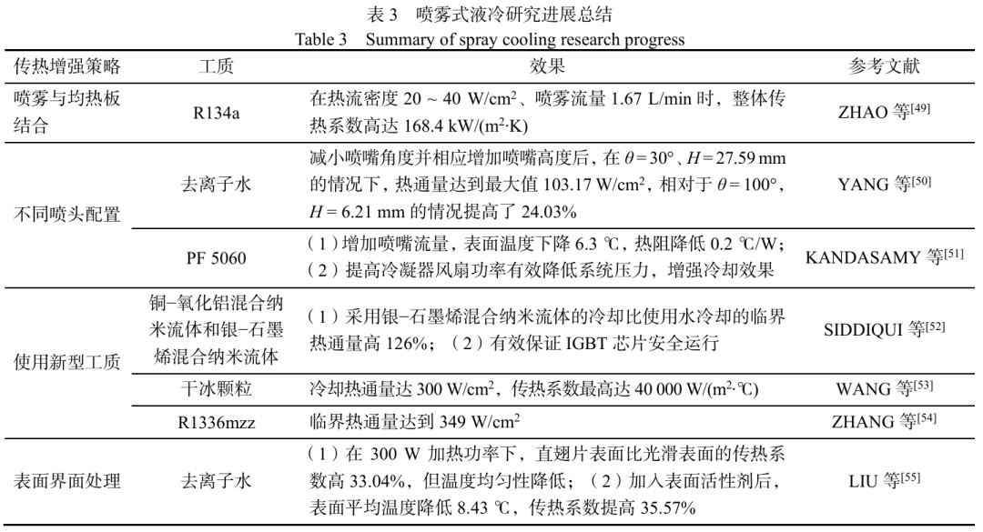 表3總結(jié)了噴霧式冷卻強(qiáng)化傳熱的多種方式。當(dāng)前噴霧式液冷應(yīng)用的難點(diǎn)在于難以預(yù)測參數(shù)變化帶來的影響,LIU等基于實(shí)驗(yàn)開發(fā)了用于預(yù)測噴霧冷卻系統(tǒng)的灰箱預(yù)測模型,但依舊具有較大局限性,平均絕對誤差達(dá)0.44216。