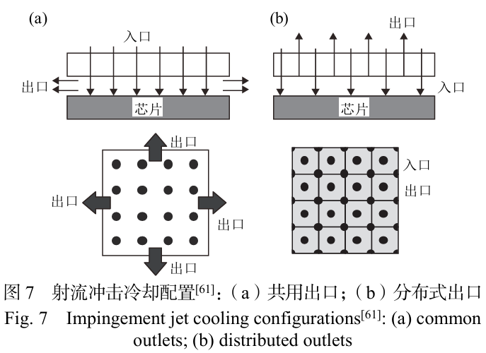 射流沖擊冷卻是一種利用高速流體沖擊固體表面以產(chǎn)生強(qiáng)烈換熱效果的方式。相比噴霧式液冷, 其最大的特點(diǎn)是無需對液體霧化。目前射流沖擊的研究主要集中在對射流的噴嘴形狀進(jìn)行改良以提高傳熱性能。MIRA-HERNáNDEZ等以半經(jīng)驗(yàn)?zāi)P蜑榛鶞?zhǔn),開發(fā)了用于預(yù)測射流陣列沖擊的相變傳熱方程,在噴射流速為1~4m/s時(shí),經(jīng)過驗(yàn)證平均絕對百分比誤差為3.88%。SHIN等采用HFE-7000進(jìn)行微尺度的射流沖擊熱傳遞機(jī)制研究,在出口雷諾數(shù)達(dá)4057時(shí),可以有效冷卻熱通量為80W/c㎡的芯片,同時(shí)得到了微尺度下的冷卻熱傳遞機(jī)制。MANGATE等發(fā)現(xiàn)帶中心孔的射流沖擊可以降低熱阻,相比不帶中心孔的射流沖擊提高25%,且相同射流頻率下,使用散熱器能使傳熱系數(shù)提高6倍。LIN等對射流沖擊的散熱器進(jìn)行優(yōu)化,提出優(yōu)化散熱器應(yīng)增加翅片,減少翅片的內(nèi)徑,當(dāng)流速為0.848/min時(shí),散熱器的熱阻僅為0.07℃/W。WEI等研究了分布式出口的射流沖擊冷卻,原理如圖7所示,對熱流密度為37.5W/c㎡的芯片進(jìn)行研究,并成功擬合出了傳熱關(guān)聯(lián)式,最大誤差不 超過30%,并且發(fā)現(xiàn)了噴嘴入口直徑對傳熱性能影響最大,但噴嘴長度和直徑對壓降影響最大。