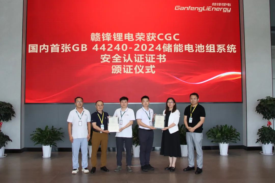 中國(guó)儲(chǔ)能網(wǎng)訊:6月3日,北京鑒衡認(rèn)證中心(CGC,以下簡(jiǎn)稱(chēng)“鑒衡”)向江西贛鋒鋰電科技股份有限公司(以下簡(jiǎn)稱(chēng)“贛鋒鋰電”)頒發(fā)了鑒衡首張儲(chǔ)能電池組系統(tǒng)GB 44240-2024《電能存儲(chǔ)系統(tǒng)用鋰蓄電池和電池組安全要求》認(rèn)證證書(shū)及該電池組系統(tǒng)所使用的電池單體的認(rèn)證證書(shū)。贛鋒鋰電電芯研發(fā)總監(jiān)唐曉偉、PACK研發(fā)總監(jiān)廖昌江、測(cè)試中心胡云經(jīng)理,鑒衡認(rèn)證中心儲(chǔ)能事業(yè)部副總經(jīng)理張光青、電池業(yè)務(wù)線總監(jiān)徐圣釗、銷(xiāo)售總監(jiān)王德科出席本次頒證儀式。