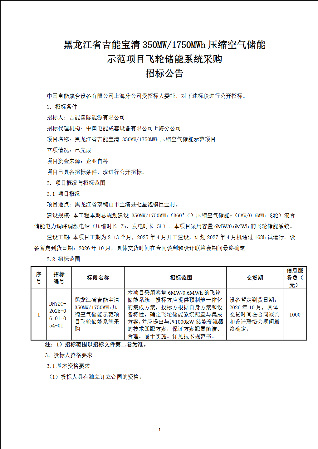 350MW/1750MWh!黑龍江寶清壓縮空氣儲能示范項目飛輪儲能系統(tǒng)采購招標(biāo)公告