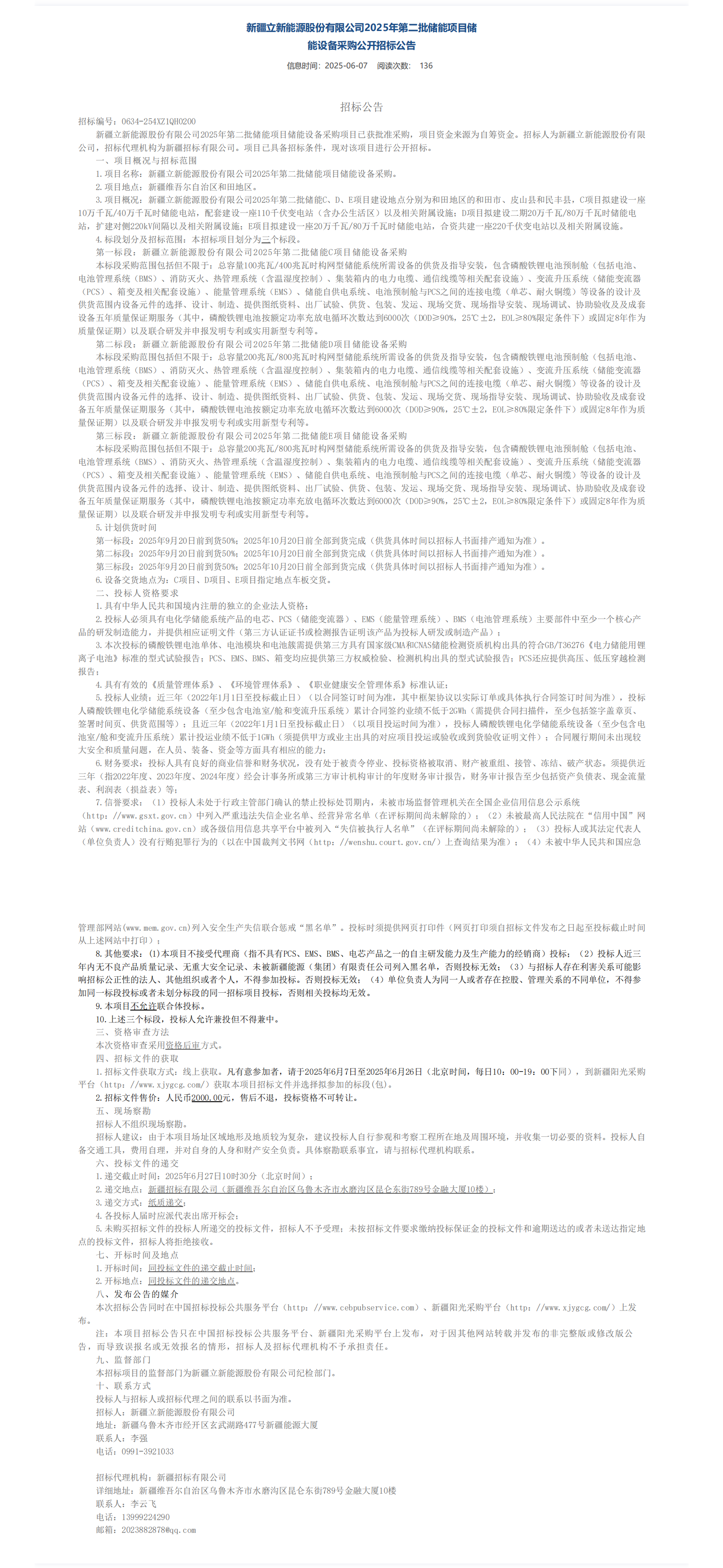中國儲能網(wǎng)訊:6月7日,新疆立新能源股份有限公司2025年第二批儲能項(xiàng)目儲能設(shè)備采購公告發(fā)布,采購新疆和田地區(qū)三個(gè)項(xiàng)目共500MW/2000MWh構(gòu)網(wǎng)型儲能設(shè)備。