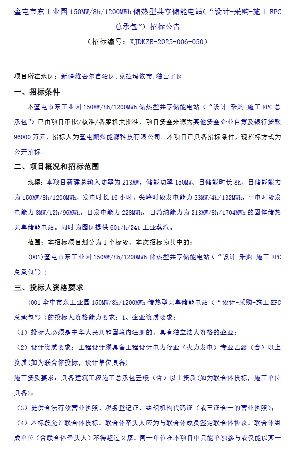 中國儲能網(wǎng)訊:6月7日,奎屯鵬煜能源科技有限公司發(fā)布了奎屯市東工業(yè)園150MW/8h/1200MWh儲熱型共享儲能電站(“設(shè)計-采購-施工EPC總承包”)招標公告。