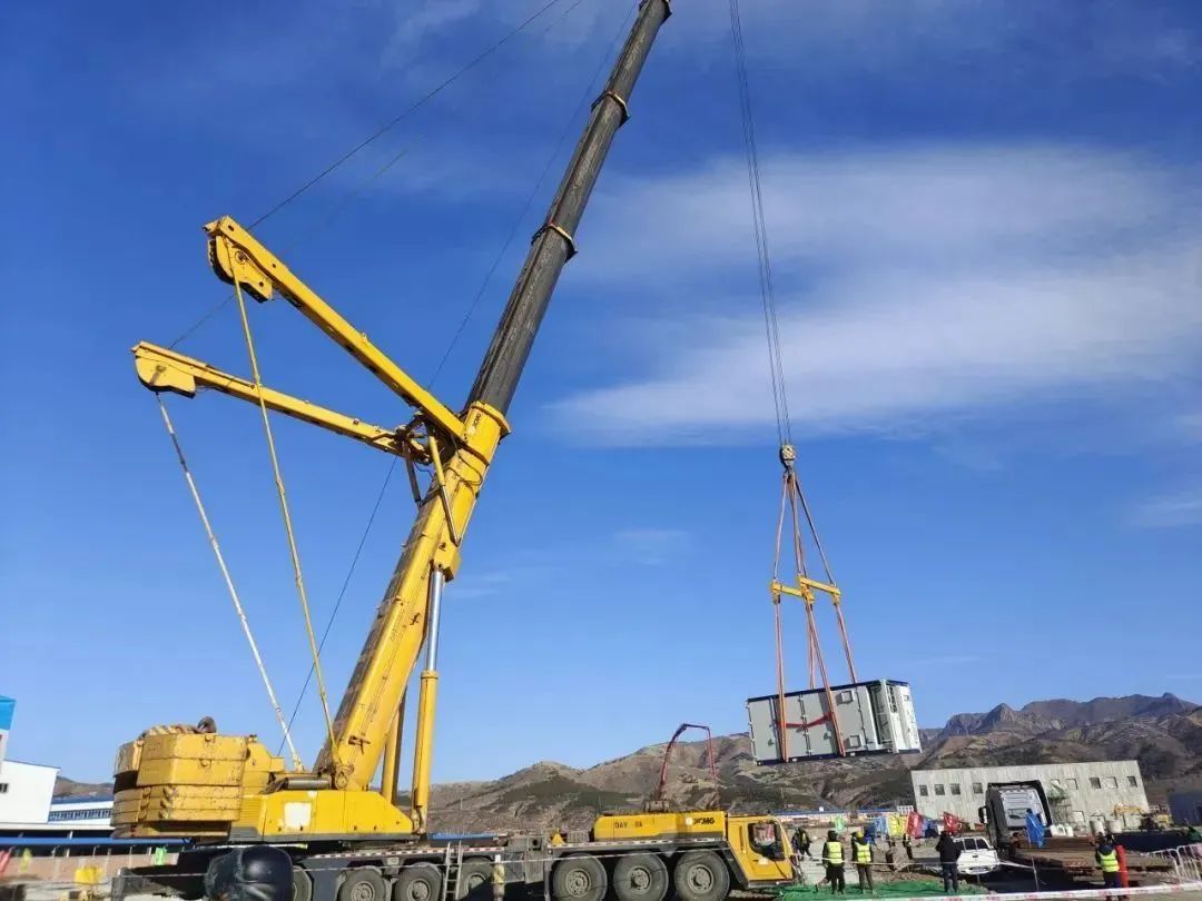 項(xiàng)目主要吊裝構(gòu)件為240臺(tái)儲(chǔ)能電池艙和60臺(tái)電控艙,單件重量分別為43噸、35噸,均超過300千牛起重設(shè)備的安裝和拆卸,屬于超危大工程,為此采用大型儲(chǔ)能設(shè)備起重吊裝技術(shù),運(yùn)用500噸全地面起重機(jī)作為主吊車,根據(jù)設(shè)備的重量、尺寸、重心位置,以及吊裝現(xiàn)場的環(huán)境條件,定制智能吊裝方案及吊裝作業(yè)應(yīng)急預(yù)案,明確應(yīng)急組織和責(zé)任,在吊裝作業(yè)前、作業(yè)過程中以及作業(yè)結(jié)束后分別進(jìn)行安全檢查與評(píng)估,以確保吊裝作業(yè)安全平穩(wěn)進(jìn)行。