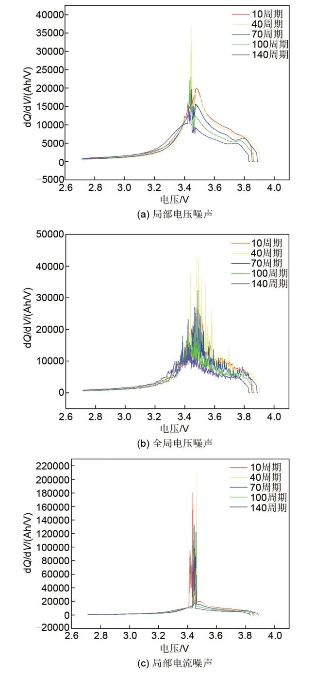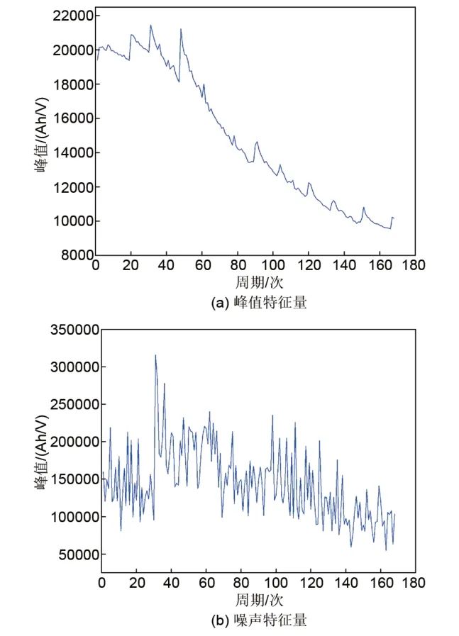 圖1所示的容量增量曲線是直接來(lái)源于原始的NASA電池?cái)?shù)據(jù)集,并未經(jīng)過(guò)任何去噪處理。然而,在實(shí)際應(yīng)用中,容量增量曲線往往會(huì)受到多種噪聲等因素的影響,這些噪聲可能包括測(cè)量的電壓噪聲、電流噪聲或工況突變引起的局部電流突變等。特別是,由于容量增量曲線存在微分運(yùn)算,干擾引起的突變就顯得比較明顯。以NASA的B5電池為例,圖2(a)是在3.4~3.6 V的電壓區(qū)間隨機(jī)選取了9個(gè)點(diǎn),對(duì)其對(duì)應(yīng)的電壓添加了標(biāo)準(zhǔn)差為0.005的局部白噪聲。圖2(b)是在全周期電壓的數(shù)據(jù)中添加了標(biāo)準(zhǔn)差為0.003的白噪聲。圖(c)是在3.4~3.6 V的電壓區(qū)間隨機(jī)選取了9個(gè)點(diǎn),對(duì)其對(duì)應(yīng)的電流添加了標(biāo)準(zhǔn)差為10的白噪聲,來(lái)表示工況的突變所導(dǎo)致的電流突變。由圖1和圖2對(duì)比可知,噪聲的存在極大地影響了容量增量曲線的變化趨勢(shì)。為衡量噪聲對(duì)特征量的影響,提取容量增量曲線的峰值為特征量進(jìn)行分析。圖3(a)為無(wú)噪聲時(shí),容量增量曲線的峰值隨充放電周期次數(shù)變化趨勢(shì)圖,圖3(b)為圖2(c)有噪聲的容量增量曲線提取的峰值特征量變化趨勢(shì)圖。由圖3可知,噪聲存在時(shí),峰值特征量與電池性能退化相關(guān)性變差,說(shuō)明噪聲對(duì)特征量表征電池性能狀態(tài)能力有非常大的影響。計(jì)算兩類容量增量曲線的皮爾遜相關(guān)系數(shù)。通過(guò)計(jì)算,原始曲線的峰值特征量的皮爾遜相關(guān)系數(shù)為0.9950,添加噪聲之后的皮爾遜相關(guān)系數(shù)為0.3846,這也證明了添加噪聲之后,特征量表征電池健康狀態(tài)能力顯著下降。