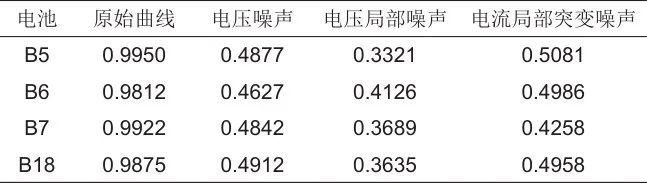 類似地,對(duì)圖2所示的3種噪聲添加方式下的容量增量曲線依次進(jìn)行了皮爾遜相關(guān)系數(shù)計(jì)算,如表1所示,特征量的相關(guān)系數(shù)都達(dá)到了0.5以下,可見(jiàn)這些噪聲的存在都會(huì)干擾特征量表征能力,影響特征量與電池健康狀態(tài)的相關(guān)性,最終將導(dǎo)致電池健康狀態(tài)估計(jì)精度的下降。