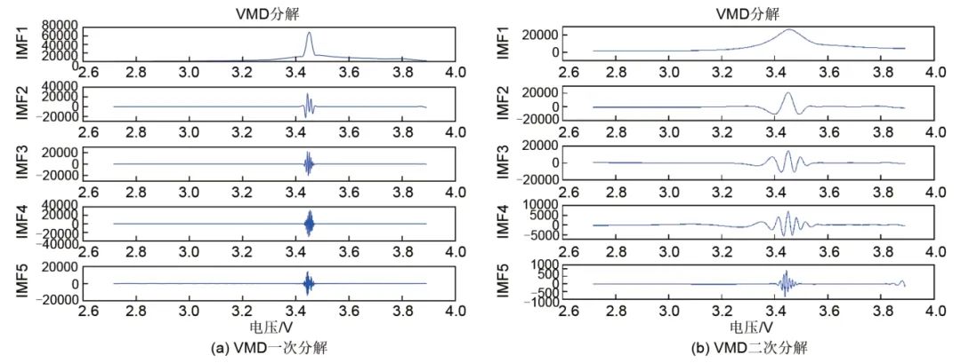 (2)采用VMD分解技術(shù)進(jìn)行去噪處理,基于去噪前后的皮爾遜相關(guān)系數(shù)對(duì)比,發(fā)現(xiàn)一次VMD分解達(dá)不到較好的電池健康狀態(tài)估計(jì)精度。為進(jìn)一步提升電池的健康狀態(tài)估計(jì)精度,對(duì)第一次VMD分量得到的IMF1分量進(jìn)行二次VMD分解,得到更好容量增量曲線,從而提升SOH估計(jì)的精度。