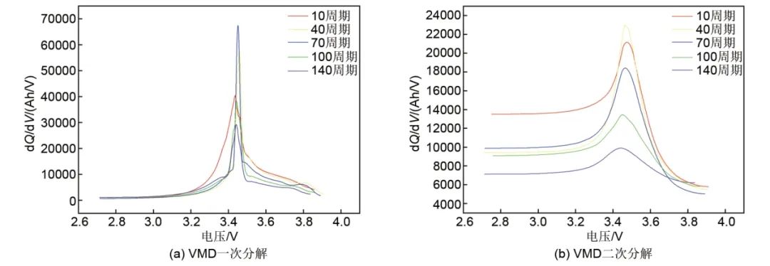 對(duì)圖2(c)所示的噪聲類型的容量增量曲線進(jìn)行一次VMD分解。圖4(a)為VMD一次分解處理的結(jié)果,其中,IMF1~IMF5是VMD分解出來(lái)的5個(gè)模態(tài)分量,分別計(jì)算IMF1~IMF5分量和圖1(a)的原始容量增量曲線的皮爾遜相關(guān)系數(shù),IMF1的皮爾遜相關(guān)系數(shù)計(jì)算結(jié)果為0.6522,IMF2為0.0026,IMF3為0.0009,IMF4為0.0006,IMF5為-0.0011。選取相關(guān)性最高的IMF1分量代表原容量增量曲線,并提取其峰值作為表征電池SOH的特征量。圖6(a)為對(duì)不同周期的容量增量曲線進(jìn)行一次VMD分解后,提取峰值特征量的變化趨勢(shì)曲線,計(jì)算該特征量與電池的健康狀態(tài)的皮爾遜相關(guān)系數(shù),結(jié)果為0.4821。可見(jiàn),進(jìn)行一次VMD分解得到的特征量不能較好地表征電池健康狀態(tài)。為進(jìn)一步提升電池健康狀態(tài)的估計(jì)精度,對(duì)第一次VMD分解的IMF1分量進(jìn)行第二次VMD分解,如圖4(b)所示,其中,IMF1~IMF5是VMD二次分解出來(lái)的5個(gè)模態(tài)分量,分別計(jì)算IMF1~IMF5和圖1(a)原始容量增量曲線的皮爾遜相關(guān)系數(shù),IMF1的皮爾遜相關(guān)系數(shù)計(jì)算結(jié)果為0.9334,IMF2為0.1026,IMF3為0.0320,IMF4為0.02306,IMF5為0.0062,選取相關(guān)性最高的IMF1分量代表原容量增量曲線。圖6(b)為對(duì)不同周期的容量增量曲線進(jìn)行二次VMD分解后,提取峰值特征量的曲線圖,計(jì)算特征量與電池的健康狀態(tài)的皮爾遜相關(guān)系數(shù),結(jié)果為0.8553,可見(jiàn),二次分解后所提取的特征量表征電池SOH的能力相比一次分解更好。圖5(a)為B5電池部分周期進(jìn)行一次VMD分解后得到的容量增量曲線,圖5(b)為B5電池部分周期二次VMD分解得到的容量增量曲線。由這兩圖中的曲線可知,通過(guò)兩次VMD分解之后得到的容量增量曲線相比一次VMD分解后的容量增量曲線去噪效果、峰值特征量區(qū)分度等特性都更好。圖7所示為本工作所提出的兩次VMD分解去噪,提取特征量表征電池健康狀態(tài)的流程示意圖。