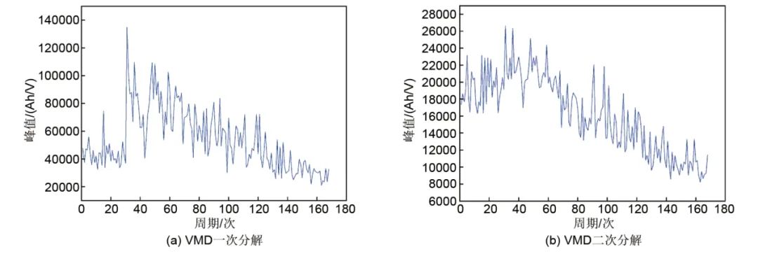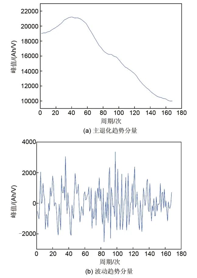(3)基于二次VMD分解去噪后的容量增量曲線提取的曲線峰值,進(jìn)一步提升SOH估計(jì)的精度,對(duì)峰值特征量集再次使用VMD分解,得到主退化和波動(dòng)趨勢(shì)兩個(gè)分量,最終將這兩個(gè)分量作為特征量表征電池的健康狀態(tài)。