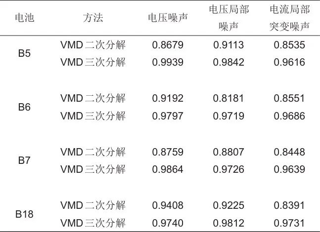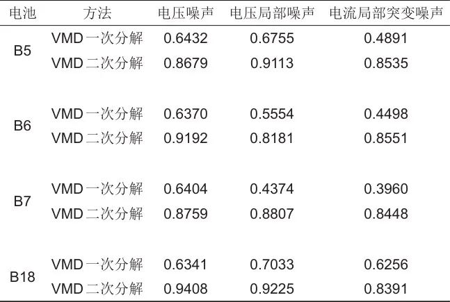 對(duì)圖2中的三種噪聲類型的容量增量曲線分別進(jìn)行一次和兩次VMD分解,提取峰值特征量,計(jì)算峰值特征量和電池健康狀態(tài)的皮爾遜相關(guān)系數(shù),如表2所示,由兩次分解對(duì)比可知,二次分解后提取的特征量相對(duì)于一次分解有更好的表征能力。因此,本工作采用二次VMD分解方法對(duì)含噪聲的容量增量曲線進(jìn)行去噪處理,并基于二次VMD分解后的IMF1低頻分量提取峰值特征量,表征電池健康狀態(tài)。