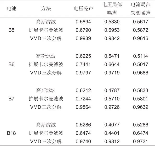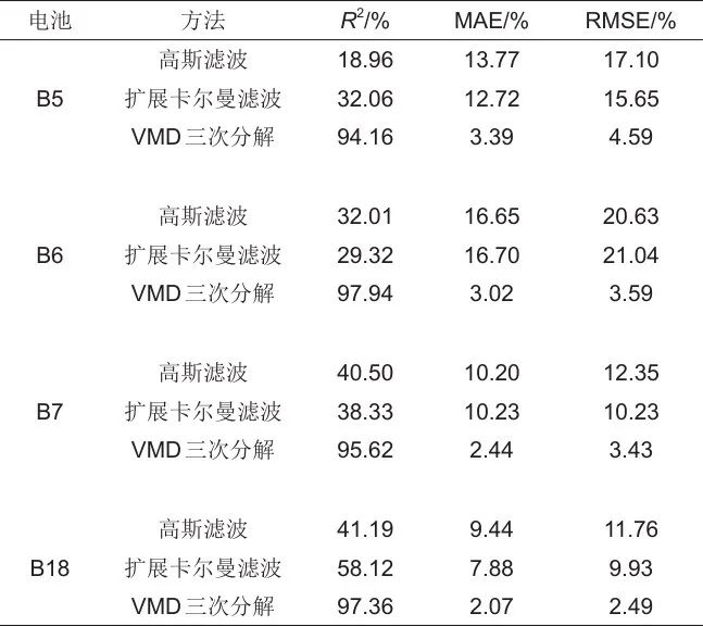 為了進(jìn)一步驗(yàn)證VMD三次分解在電池健康狀態(tài)估計(jì)中去噪的優(yōu)越性,本小節(jié)將VMD三次分解與高斯濾波(Gaussian filtering)和擴(kuò)展卡爾曼濾波(extended Kalman filtering,EKF)兩種應(yīng)用廣泛的濾波方法進(jìn)行對(duì)比。