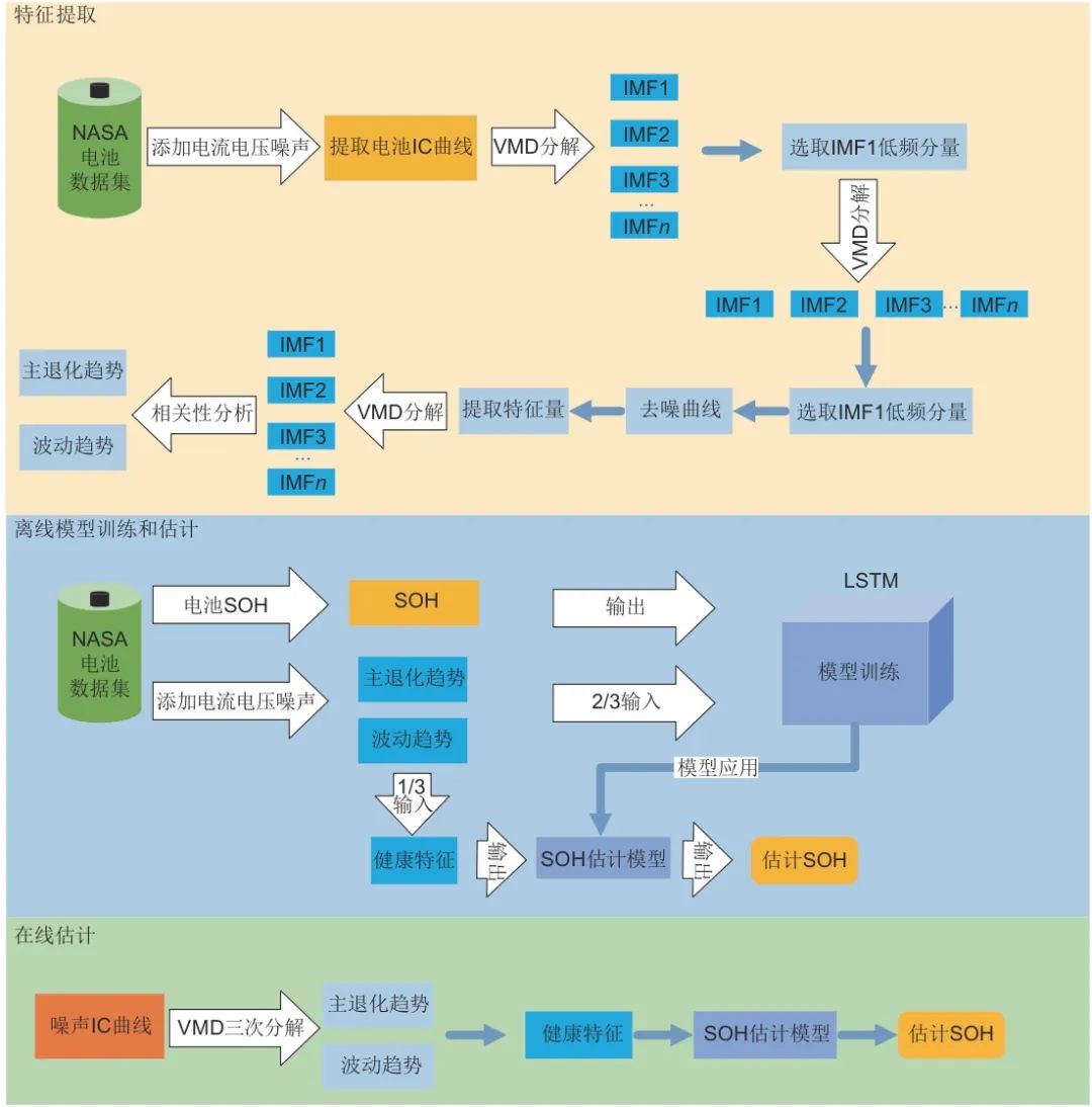 第三部分是在線估計(jì)階段。在這一階段,通過(guò)對(duì)帶噪聲的電池IC曲線進(jìn)行三次VMD分解,提取出主退化趨勢(shì)和波動(dòng)趨勢(shì)兩個(gè)特征分量作為健康特征,并利用長(zhǎng)短期記憶神經(jīng)網(wǎng)絡(luò)算法實(shí)現(xiàn)電池狀態(tài)的在線估計(jì)。