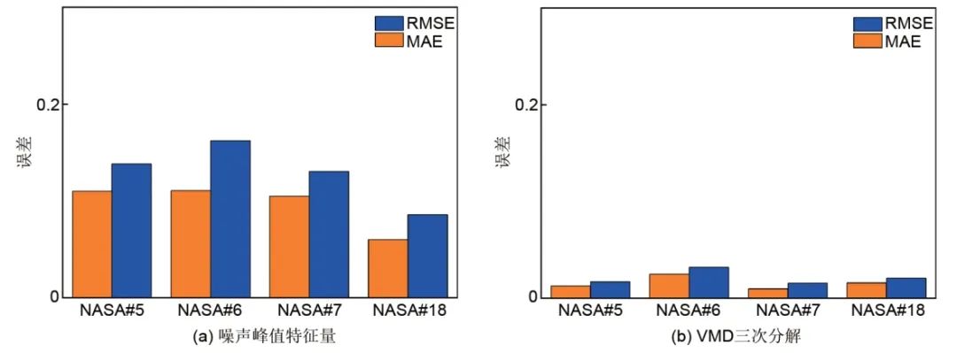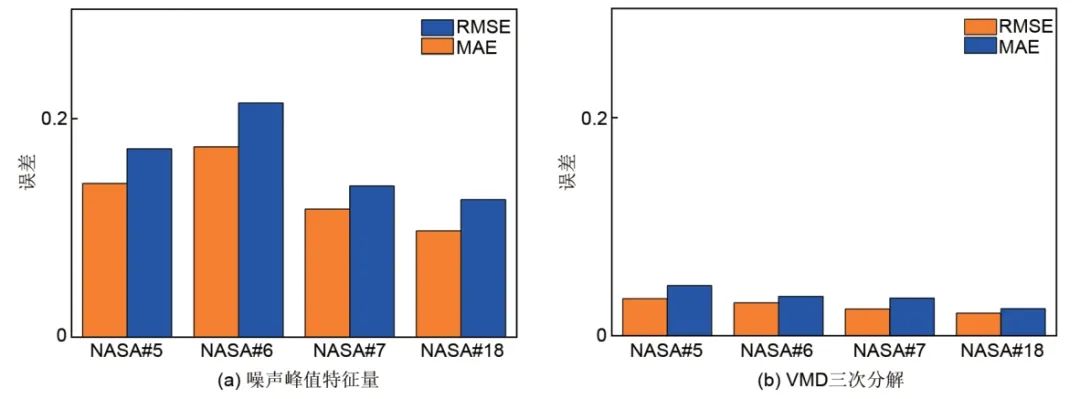 類似地,對(duì)圖2中的3種類型噪聲的容量增量曲線分別進(jìn)行去噪前后SOH估計(jì)對(duì)比實(shí)驗(yàn)。圖13~15所示為三類噪聲下的容量增量曲線,去噪前后SOH估計(jì)效果評(píng)價(jià)指標(biāo)圖,其中(a)圖是去噪前的容量增量曲線提取的峰值特征量估計(jì)電池健康狀態(tài)的結(jié)果,(b)圖為容量增量曲線經(jīng)過(guò)VMD三次分解之后提取的特征量估計(jì)電池健康狀態(tài)的結(jié)果,由圖可知,(b)圖的MAE、RMSE的SOH估計(jì)評(píng)價(jià)值明顯小于(a)圖,從而表明本工作所提電池SOH估計(jì)方法能夠顯著降低噪聲對(duì)鋰電池健康狀態(tài)估計(jì)的影響,可在強(qiáng)干擾下,保障SOH估計(jì)的準(zhǔn)確性和可靠性。