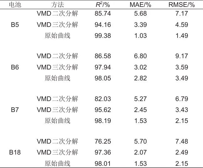 表5 NASA電池電流噪聲VMD二次分解和三次分解以及原始曲線的SOH估計(jì)結(jié)果