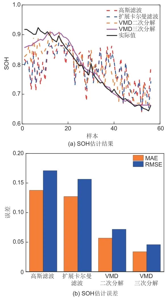 為了進(jìn)一步驗(yàn)證所提方法的優(yōu)越性,將本工作所提的VMD三次分解方法與高斯濾波和擴(kuò)展卡爾曼濾波方法進(jìn)行SOH估計(jì)對(duì)比實(shí)驗(yàn)。圖16展示了在電流噪聲下,針對(duì)B5電池應(yīng)用不同去噪方法后的SOH估計(jì)結(jié)果。從圖16(b)可以看出,本工作所提方法的估計(jì)誤差最小,且明顯優(yōu)于高斯濾波和擴(kuò)展卡爾曼濾波的結(jié)果。從而表明,本工作提出的VMD三次分解方法在去噪方面具有顯著的優(yōu)勢(shì)。