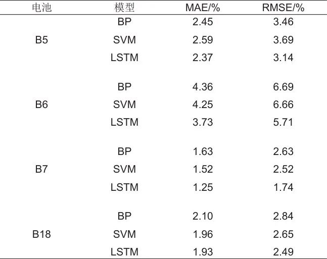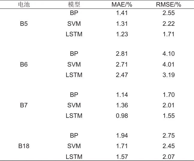 為了進(jìn)一步驗(yàn)證去噪后特征對(duì)LSTM模型的適應(yīng)性,還將所提的LSTM模型與BP神經(jīng)網(wǎng)絡(luò)模型、支持向量機(jī)(SVM)模型進(jìn)行SOH估計(jì)對(duì)比實(shí)驗(yàn)。圖17展示了在不同模型下,針對(duì)B5電池的SOH估計(jì)結(jié)果。從圖17(b)可以看出,LSTM模型的估計(jì)誤差最小,表明本工作提出的LSTM模型對(duì)去噪后的特征具有很好的適應(yīng)性。