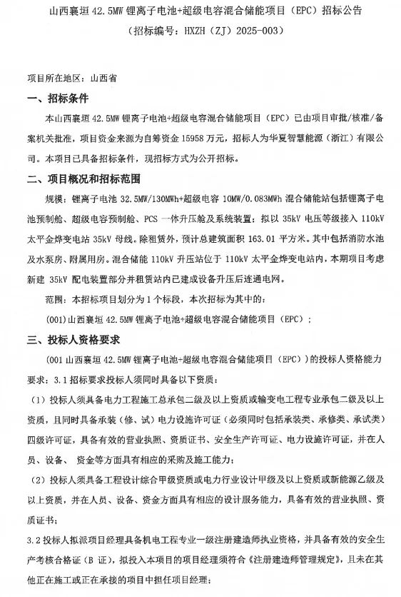 中國儲能網訊:2025年6月9日,華夏智慧能源(浙江)有限公司發(fā)布了山西襄垣42.5MW鋰離子電池+超級電容混合儲能項目EPC招標公告,合計規(guī)模42.5MW/130MWh,項目資金來源為自籌資金15958萬元,約合1.228元/Wh。
