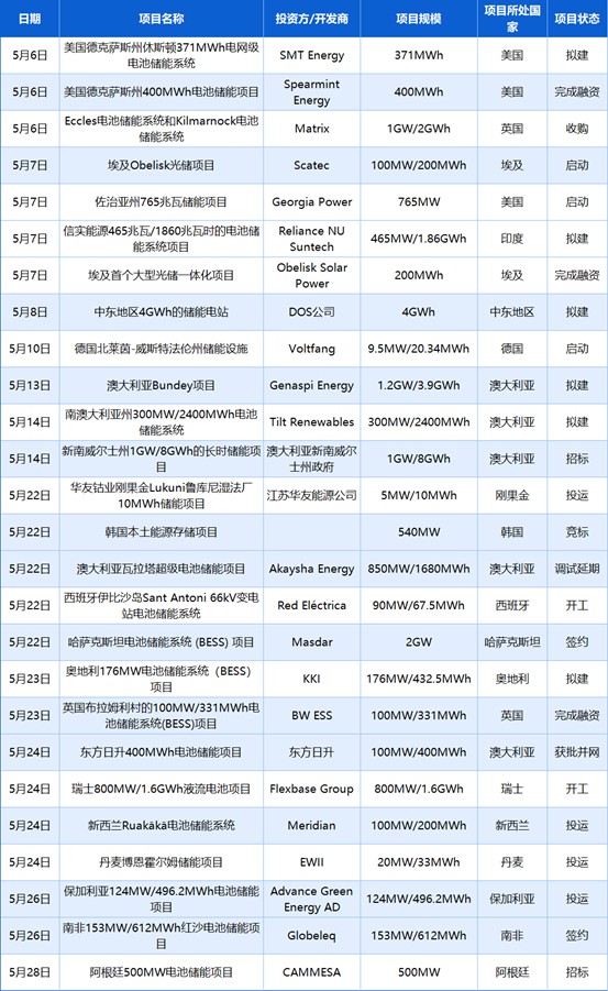 中國儲能網(wǎng)訊:2025年5月,CESA儲能應(yīng)用分會產(chǎn)業(yè)數(shù)據(jù)庫追蹤到26起海外儲能項目建設(shè)動態(tài)事件,總規(guī)模超29.21GWh,涉及SMT Energy、Spearmint Energy、Matrix、Scatec、Georgia Power、Reliance NU Suntech、Obelisk Solar Power、DOS公司、Voltfang、Genaspi Energy等全球能源投資方/開發(fā)商,建設(shè)地點位于澳大利亞、美國、英國、埃及、印度、新西蘭、西班牙、瑞士、南非、韓國、哈薩克斯坦、剛果金、德國、丹麥、保加利亞、奧地利、阿根廷等國家。