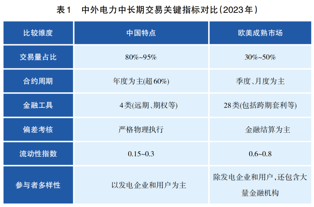 全球電力市場的多樣性為中長期交易提供了豐富的實踐樣本,中外電力中長期交易也各有不同。中國以“穩(wěn)中求進”的漸進式改革構(gòu)建特色路徑,而歐美成熟市場則依托金融衍生品形成高流動性生態(tài)。國內(nèi)外中長期交易差異具體體現(xiàn)在三大方面(見表1)。