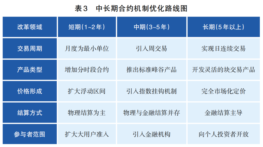首先,中長期合約機制有待進一步優(yōu)化(見表3)。為推動中長期交易向更高水平發(fā)展,需要在以下三個方面進行機制創(chuàng)新: