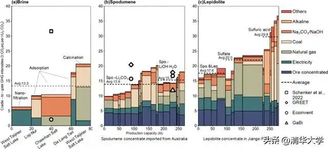 圖1.中國分工廠的電池級鋰碳足跡。(a)鹽湖提鋰(b)鋰輝石提鋰(c)鋰云母提鋰