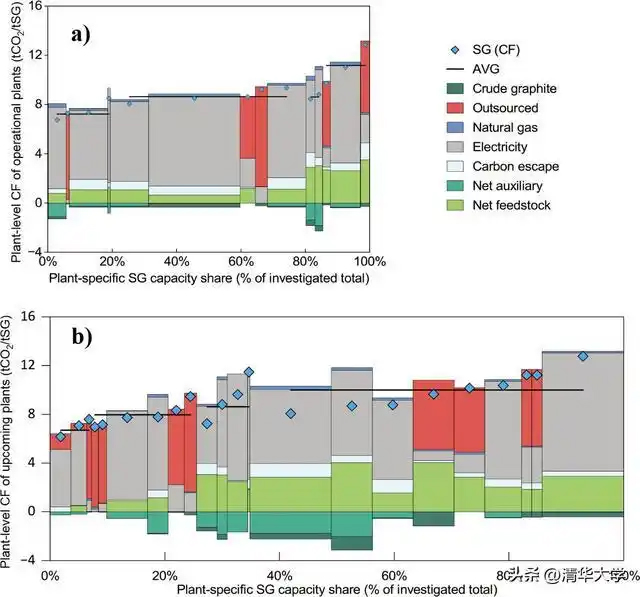 圖2.我國分工廠的電池級人造石墨碳足跡。(a)投產運營(b)擬建工廠