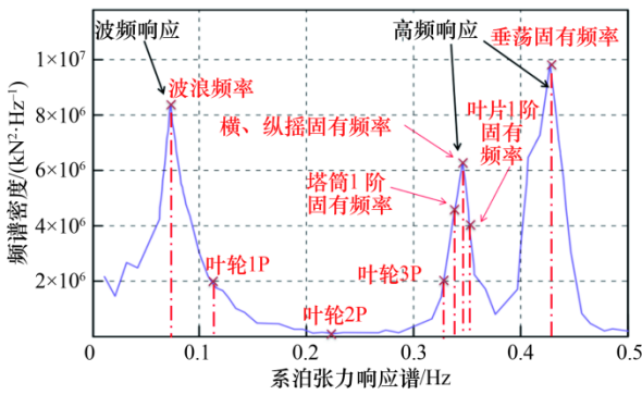 對于張力腿浮式油氣平臺,共振現(xiàn)象主要體現(xiàn)在風浪環(huán)境載荷與系泊系統(tǒng)的耦合振動上,相關的振動響應求解方法、工程設計軟件、水池試驗較成熟。而在浮式風電領域,張力腿式基礎不僅需要應對風浪環(huán)境載荷激勵,而且需要考慮固有周期<5 s的多種高頻共振成分,如風力機葉輪3P、塔筒1階固有頻率、葉片1階固有頻率、基礎縱搖/橫搖固有頻率、垂蕩固有頻率等。為此,張力腿浮式風電機組仿真分析應采用一體化全耦合技術,以充分掌握共振響應特性并揭示共振機理。在此基礎上,研究避免或者抑制張力腿浮式風力機高頻共振的設計方法,以更好指導實際工程設計;采用一體化全耦合方法,分析張力腿浮式基礎系泊的張力響應譜,以直觀展示此類基礎與風力機之間的復雜共振特性(見圖3)。