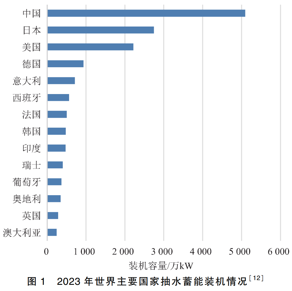 截至2023年底,全球抽水蓄能裝機(jī)容量達(dá)到17 913萬kW[11]。其中,我國抽水蓄能裝機(jī)容量5 094萬kW,居世界首位;日本、美國的抽水蓄能裝機(jī)容量分別為2316萬、2189萬kW,分列第2位和第3位。全球抽水蓄能裝機(jī)容量排名前十的國家分別為中國、日本、美國、德國、意大利、西班牙、法國、韓國、印度、瑞士,如圖1所示[12]。