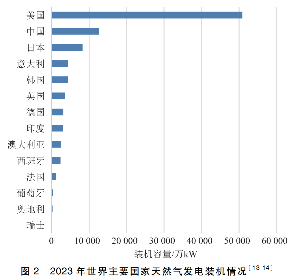 截至2023年底,中國、美國、日本、意大利等主要國家的天然氣發(fā)電裝機(jī)容量如圖2所示[13-14]。其中,奧地利、葡萄牙、法國、西班牙、德國、意大利的燃?xì)獍l(fā)電裝機(jī)容量根據(jù)天然氣發(fā)電量估算。