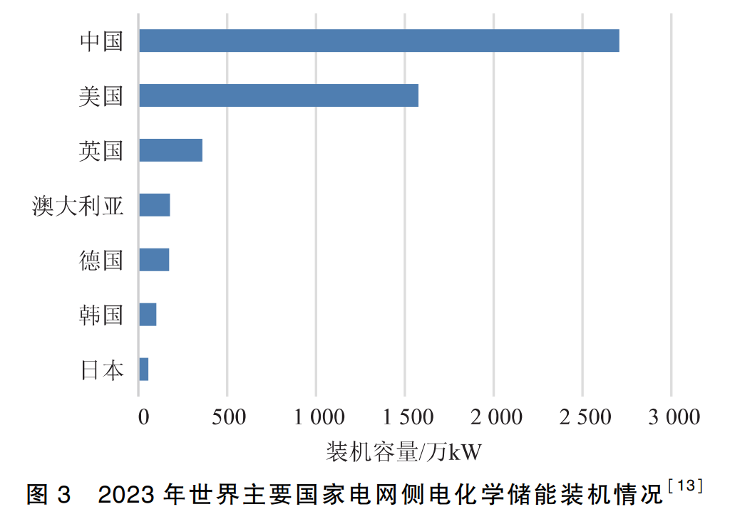 截至2023年底,全球電化學(xué)儲能裝機(jī)容量達(dá)到9130萬kW。從裝機(jī)容量和儲能量占比來看,抽水蓄能仍是儲能領(lǐng)域的主力軍,但近年來新型儲能也得到了較快發(fā)展。2021年,全球新增投運(yùn)新型儲能項(xiàng)目首次突破1000萬kW,累計(jì)裝機(jī)達(dá)到2540萬kW。2022年,全球新型儲能累計(jì)裝機(jī)規(guī)模達(dá)4570萬kW,年增長率80%,鋰離子電池占據(jù)絕對主導(dǎo)地位,以用戶側(cè)和電源側(cè)為主[15]。根據(jù)Bp能源統(tǒng)計(jì)數(shù)據(jù),截至2023年底,世界主要國家電網(wǎng)側(cè)電化學(xué)儲能裝機(jī)容量如圖3所示[13]。