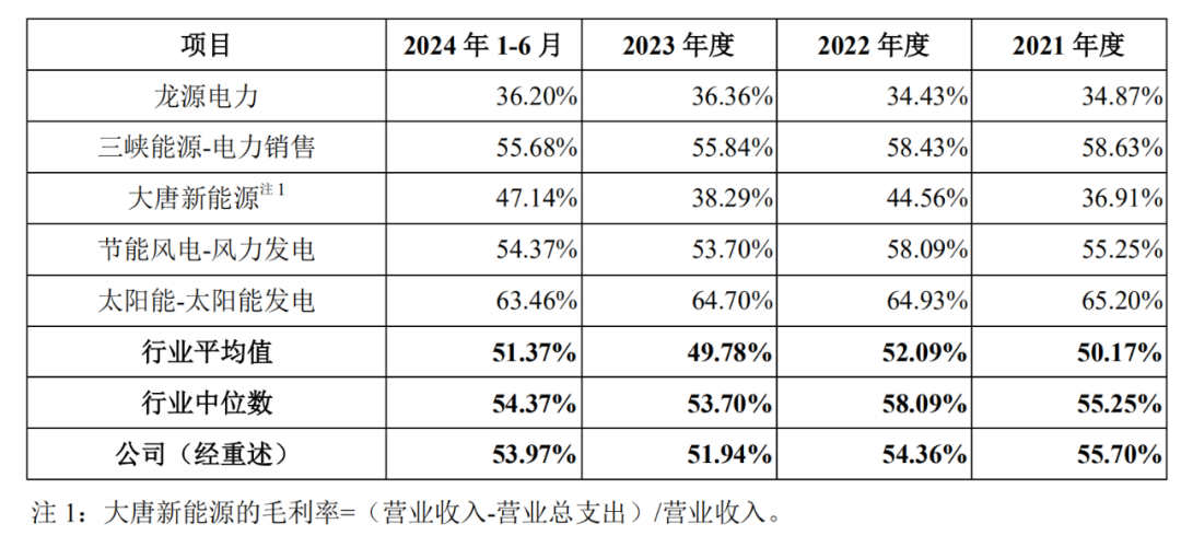 據(jù)招股書(shū)披露,華電新能源的主營(yíng)業(yè)務(wù)毛利略高于同行業(yè)可比上市公司平均水平,2023年和2024年1-6月分別為51.94%和53.97%。
