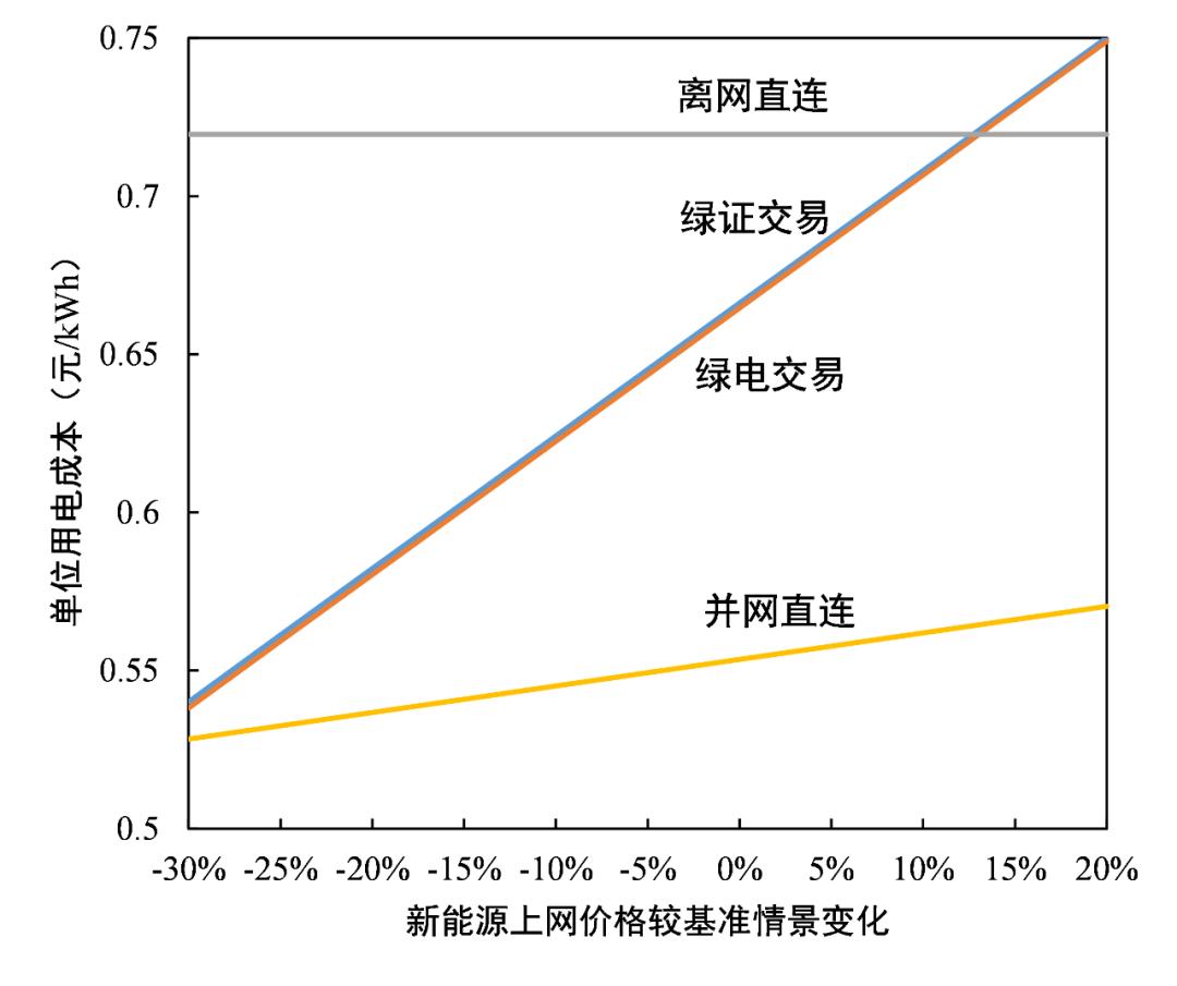 隨著綠電價(jià)格的下降,通過(guò)公共電網(wǎng)購(gòu)電的三種模式單位用電成本將隨之下降。2024年,算例所在地區(qū)的新能源市場(chǎng)平均價(jià)格(0.4023元/千瓦時(shí))主要對(duì)標(biāo)煤電基準(zhǔn)電價(jià)(0.372元/千瓦時(shí)),較其度電成本(風(fēng)0.2249元、光0.3594元)高79%和12%。在新能源全面入市政策推動(dòng)下,若新能源交易價(jià)格實(shí)現(xiàn)下降,那么綠電、綠證交易模式將逐漸凸顯其成本優(yōu)勢(shì)(本算例新能源交易價(jià)格較2024年均價(jià)下降30%左右),并網(wǎng)型綠電直連模式的經(jīng)濟(jì)競(jìng)爭(zhēng)力將會(huì)受到一定挑戰(zhàn)。