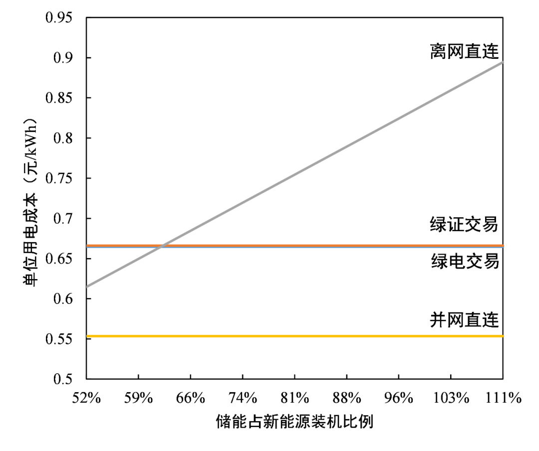 離網(wǎng)型直連模式需要大量的儲(chǔ)能進(jìn)行調(diào)峰,因此度電成本最高。本文基準(zhǔn)場(chǎng)景中儲(chǔ)能放電時(shí)長(zhǎng)為4小時(shí),在2小時(shí)和8小時(shí)下,數(shù)據(jù)中心單位用電成本分別降低24%和上升49%,可見(jiàn)離網(wǎng)模式下儲(chǔ)能的配置容量對(duì)其經(jīng)濟(jì)性有決定性影響。