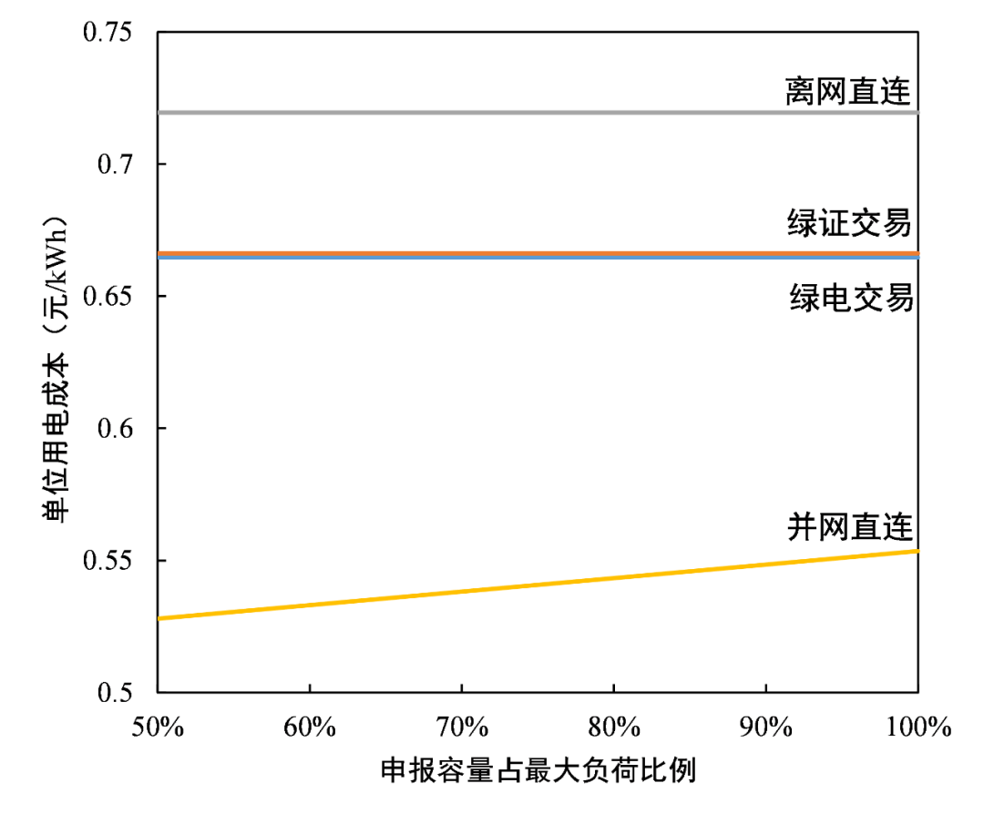 測(cè)算結(jié)果表明,在基準(zhǔn)情景的參數(shù)設(shè)定條件下,并網(wǎng)型直連模式的單位用電成本最低。該模式結(jié)合了大電網(wǎng)供電和直連模式的優(yōu)勢(shì):一方面,借助“綠電直連”機(jī)制,數(shù)據(jù)中心可直接獲取物理可溯源的綠色電力,同時(shí)鎖定具有成本優(yōu)勢(shì)的綠電價(jià)格;另一方面,通過(guò)保留與公共電網(wǎng)的連接,數(shù)據(jù)中心可獲得電網(wǎng)備用支持,滿足調(diào)峰、備用等不確定性電力需求,顯著降低對(duì)儲(chǔ)能的依賴。但需要說(shuō)明的是,當(dāng)前系統(tǒng)備用費(fèi)收取細(xì)則尚未出臺(tái),該測(cè)算結(jié)果是基于系統(tǒng)備用費(fèi)按容(需)量電價(jià)考慮的。傳統(tǒng)容(需)量電價(jià)是基于穩(wěn)定負(fù)荷設(shè)計(jì)的,并網(wǎng)型直連項(xiàng)目若不配置儲(chǔ)能,整體負(fù)荷特性表現(xiàn)為較大的波動(dòng)性(平均負(fù)荷率較低),需要電網(wǎng)頻繁為其調(diào)峰,系統(tǒng)備用成本可能升高。
