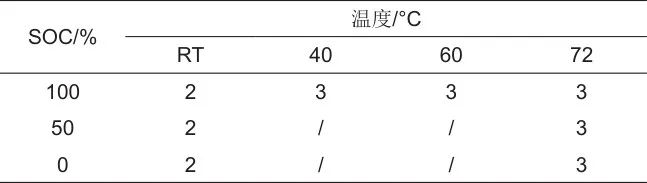 完成參考性能測試之后,調(diào)整電池荷電狀態(tài)至實驗值(100% SOC、50% SOC、0 SOC)。本實驗中采用ESPEC GPH 30高溫試驗箱進行環(huán)境溫度控制,溫度設定值分別為40 ℃、60 ℃、72 ℃,高溫儲存實驗階段周期為5天(或其整數(shù)倍),每一周期結(jié)束后進行一次參考性能測試;室溫(RT)對照組儲存實驗階段周期為30天。