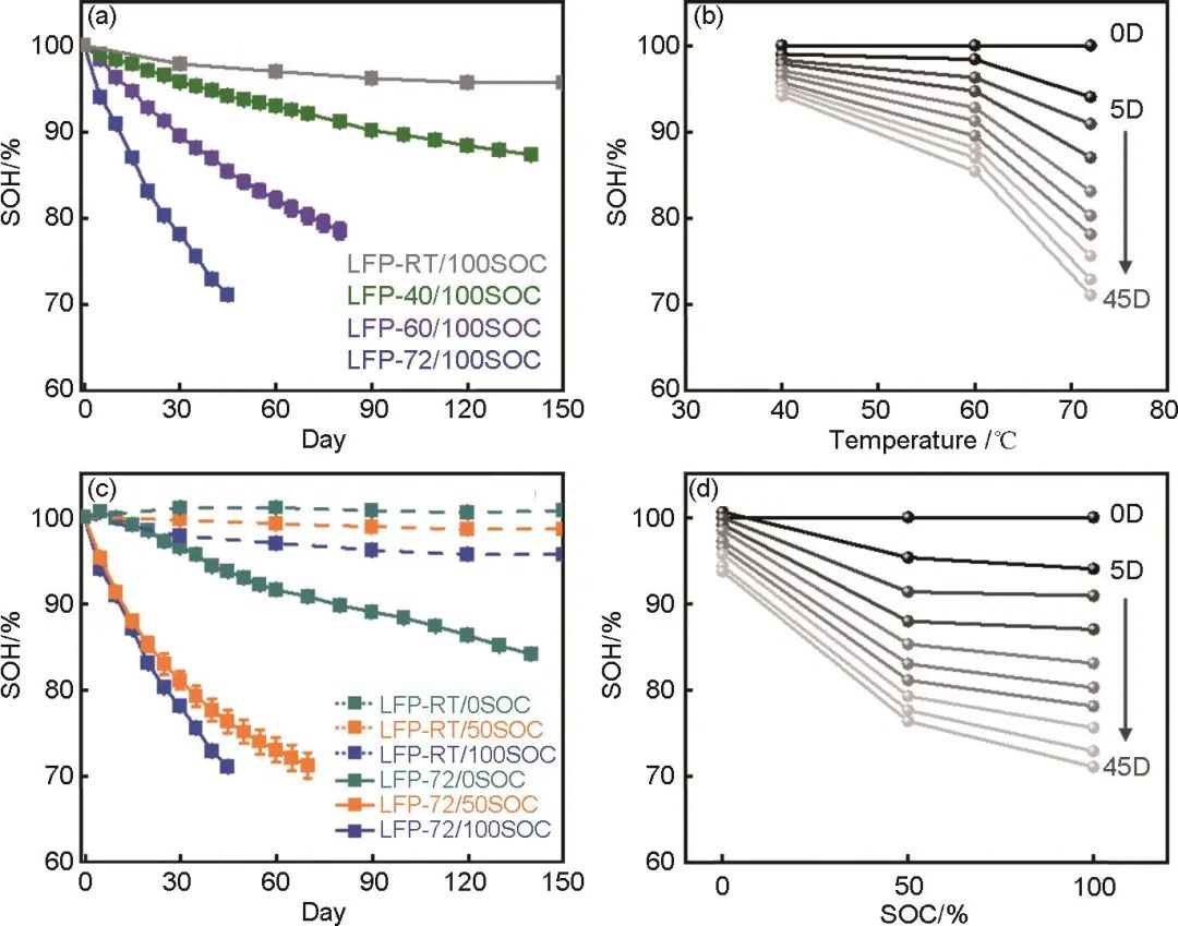 圖1 (a) 在滿電狀態(tài) (100% SOC) 下,不同溫度儲存的LFP電池SOH隨時間變化曲線,(b) 為相應的SOH與環(huán)境溫度映射關(guān)系圖;(c) 室溫 (RT,虛線) 和72 ℃(實線) 時,不同SOC儲存電池SOH隨時間變化曲線,(d) 為相應的SOH與SOC映射關(guān)系圖